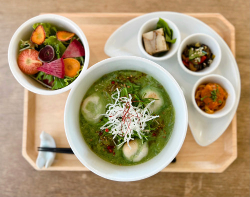 惣兵衛米100%の玄米麺を緑鮮やかな熱々スープでアレンジ。